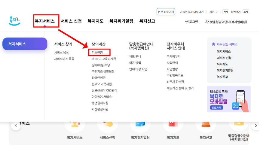 - 국민연금공단 홈페이지 접속 → 기초연금 모의계산 메뉴 클릭