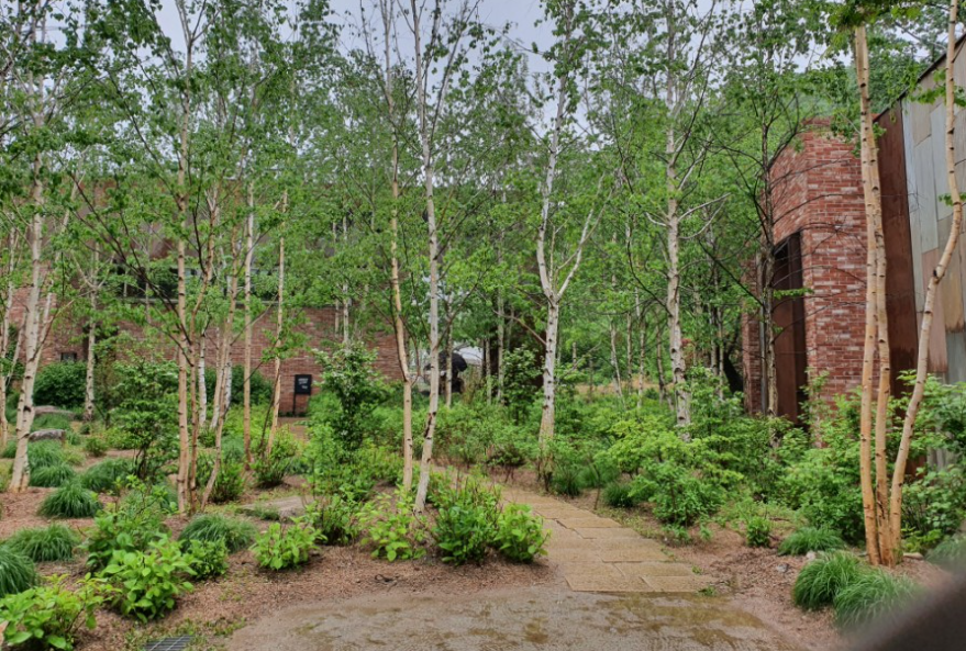 주차장에서 숲길을 따라 차분하게 걸어들어가면, 붉은 벽돌과 조경이 자연스럽게 공간으로 인도한다. 입구부터 자연의 향기와 조용한 정취가 함께한다