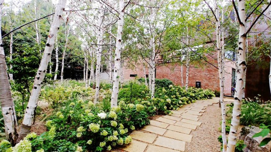 입구부터 자작나무 숲길이 이어지며, 붉은 벽돌 외관이 은밀히 숲 속에 숨어 있는 듯한 느낌을 준다. 마치 비밀의 공간에 들어온 듯 신비로운 분위기를 느낄 수 있다