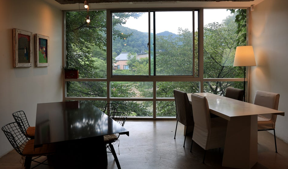 1층과 2층 모두 통유리 기반으로 설계되어 있어, 실내에서 바라보는 풍경이 매력적이다. 특히 2층은 천장이 높고 창이 크기 때문에 탁 트인 자연 경관을 감상하기 좋다