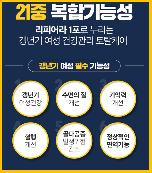리피어라는 단순히 호르몬 균형을 돕는 기능에 그치지 않고, 항산화 작용·피로 개선·면역력 강화·혈행 개선·피부 탄력 회복 등 전신 건강을 동시에 관리할 수 있도록 고안된 복합 기능성 제품입니다.