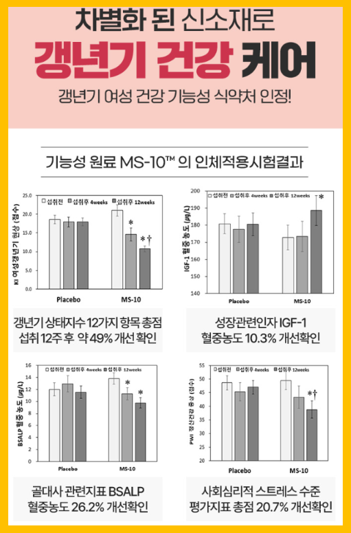 - 갱년기 여성의 다양한 증상을 한 번에 관리할 수 있는 복합 기능형 건강기능식품