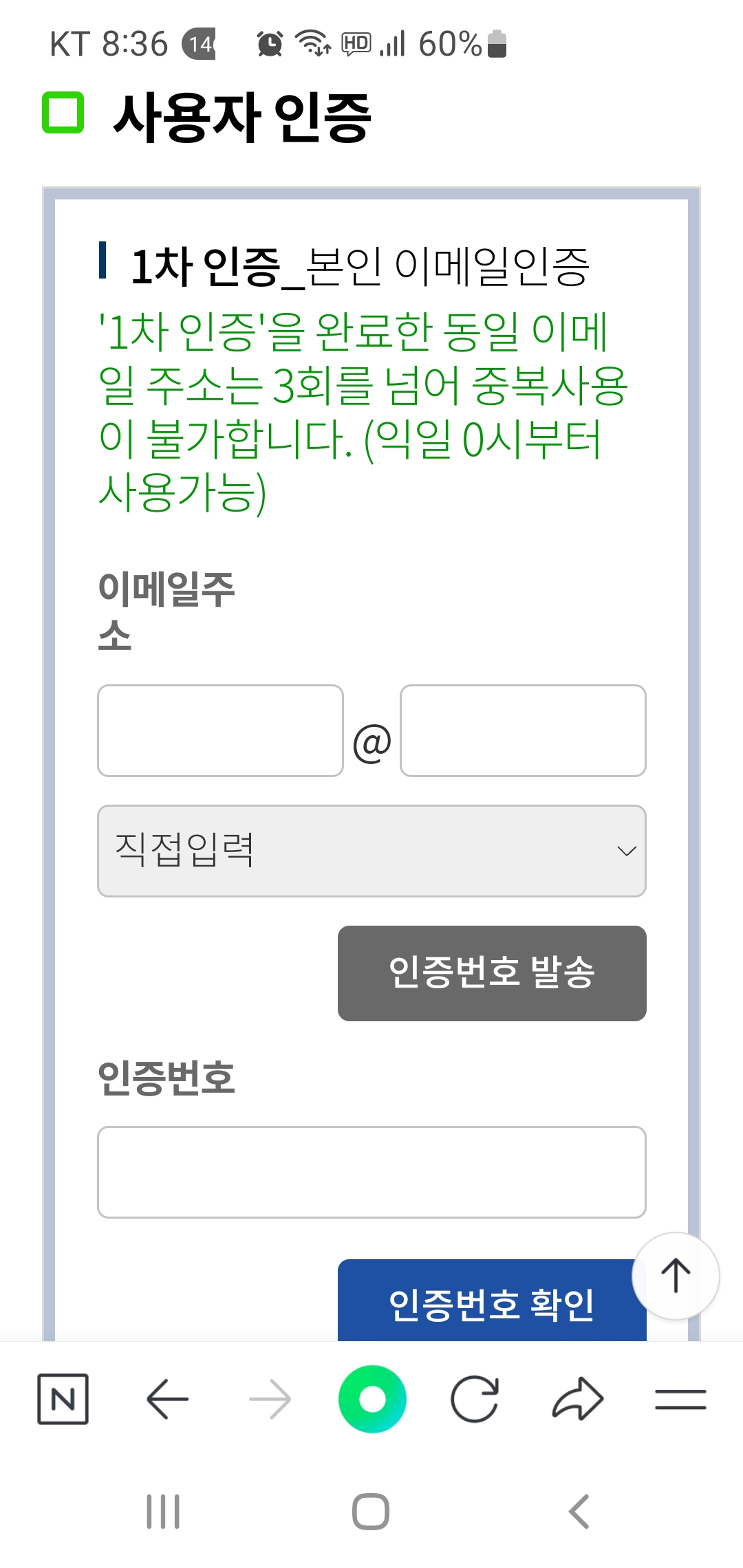 본인 이메일을 입력하면 인증번호가 발송됩니다. 번호 입력 후 로봇 방지 절차를 거치면 조회 단계로 넘어갑니다.