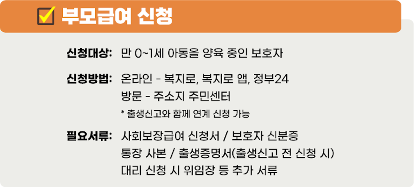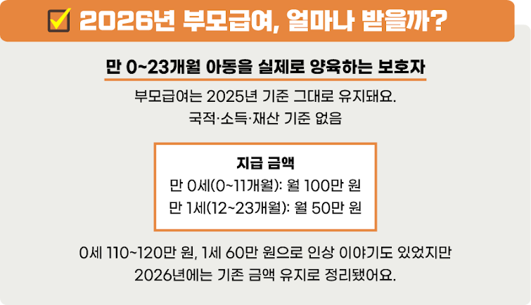 • 1세 아동: 부모급여 월 50만 원 + 아동수당 월 10만 원 = 총 60만 원