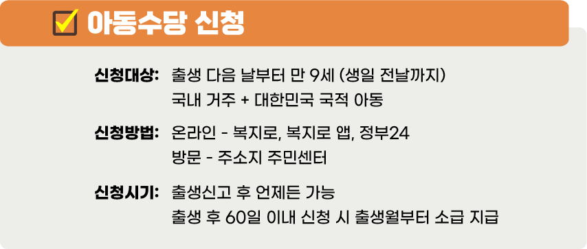 : 주소지 행정복지센터(동사무소) 방문 신청. 출생 신고 시 '행복 출산 원스톱 서비스'를 이용하면 아동수당, 부모급여 등을 한 번에 신청할 수 있습니다.